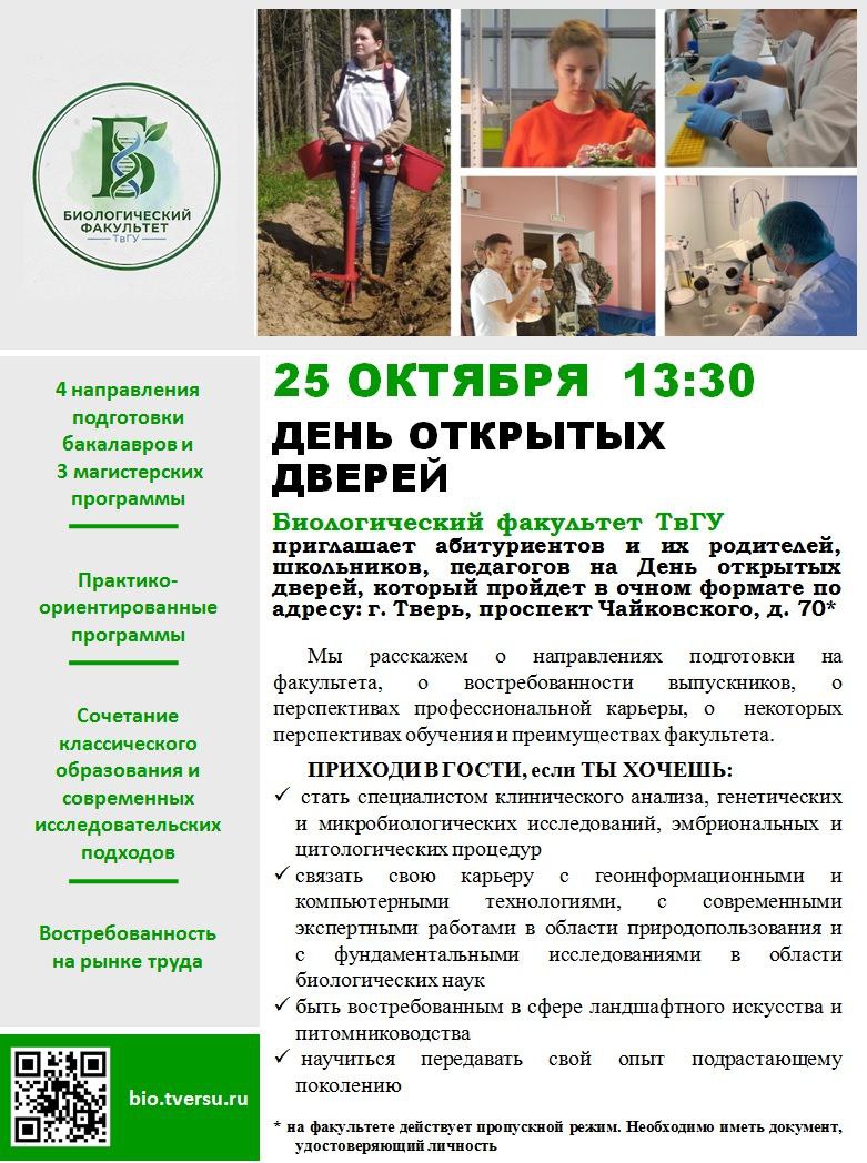 Мы приглашаем вас на День открытых дверей, который состоится 25 октября 2025 г. (суббота) в 13.30 по адресу: г. Тверь, проспект Чайковского, д. 70, учебный корпус Биологический биологического факультета, аудитория 210 (2 этаж).