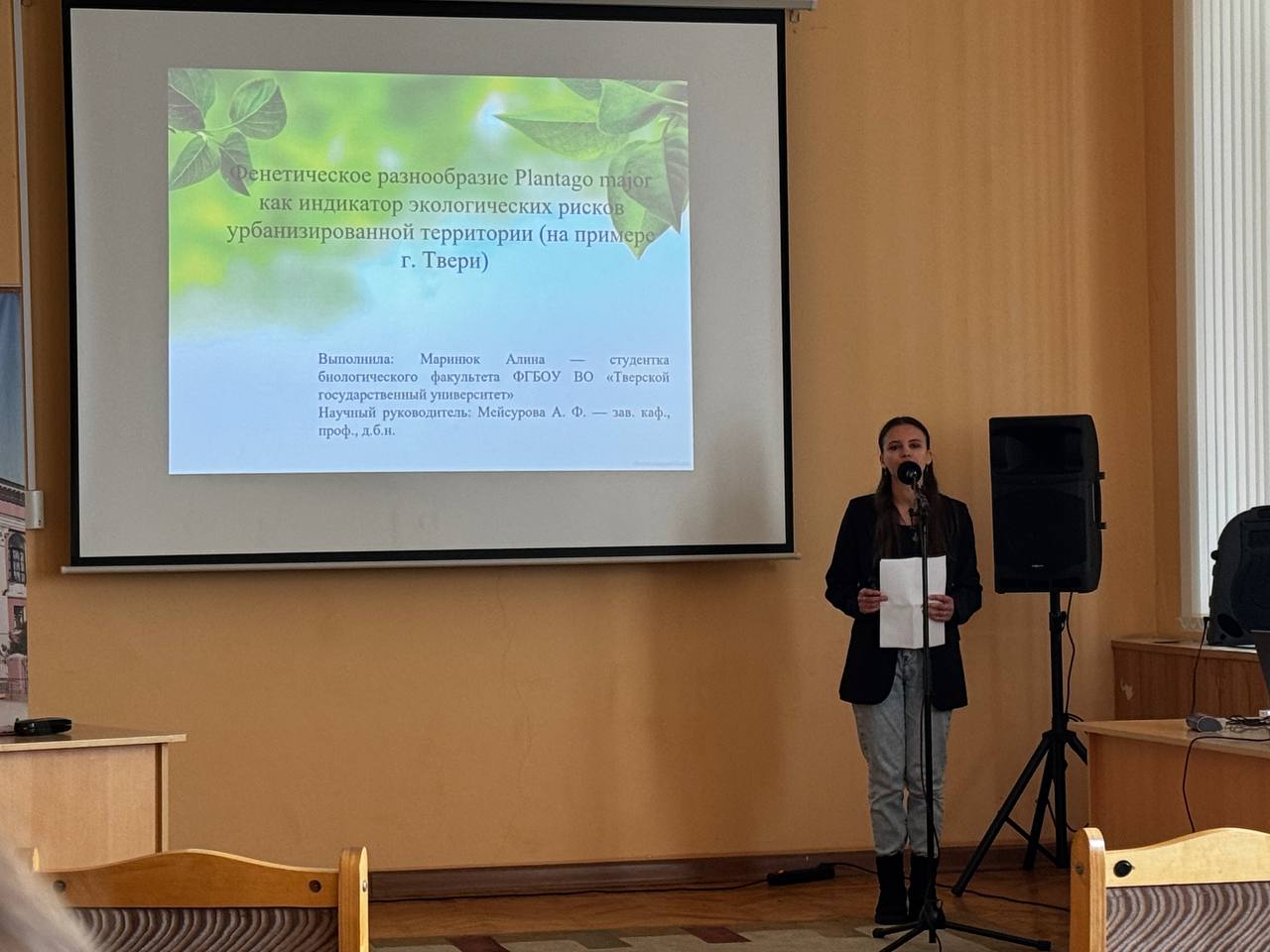 Отдельно хочется отметить участие магистрантов факультета в работе Круглого стола, посвященного актуальным проблемам экологии. Свои доклады наши студенты посвятили методам изучения состояния окружающей среды, поддержанию биологической стабильности и сохранению устойчивости культурных растений. Доклад магистранки 2 курса Алины Васильевны Маринюк «Фенетическое разнообразие Plantago major как индикатор экологических рисков урбанизированной территории ( на примере г. Твери)» и магистранта 1 курса Ильи Александровича Уловкова «Особенности развития эксплантов картофеля при микроклональном размножении» вызвали живой интерес у участников и были отмечены дипломами выставки.