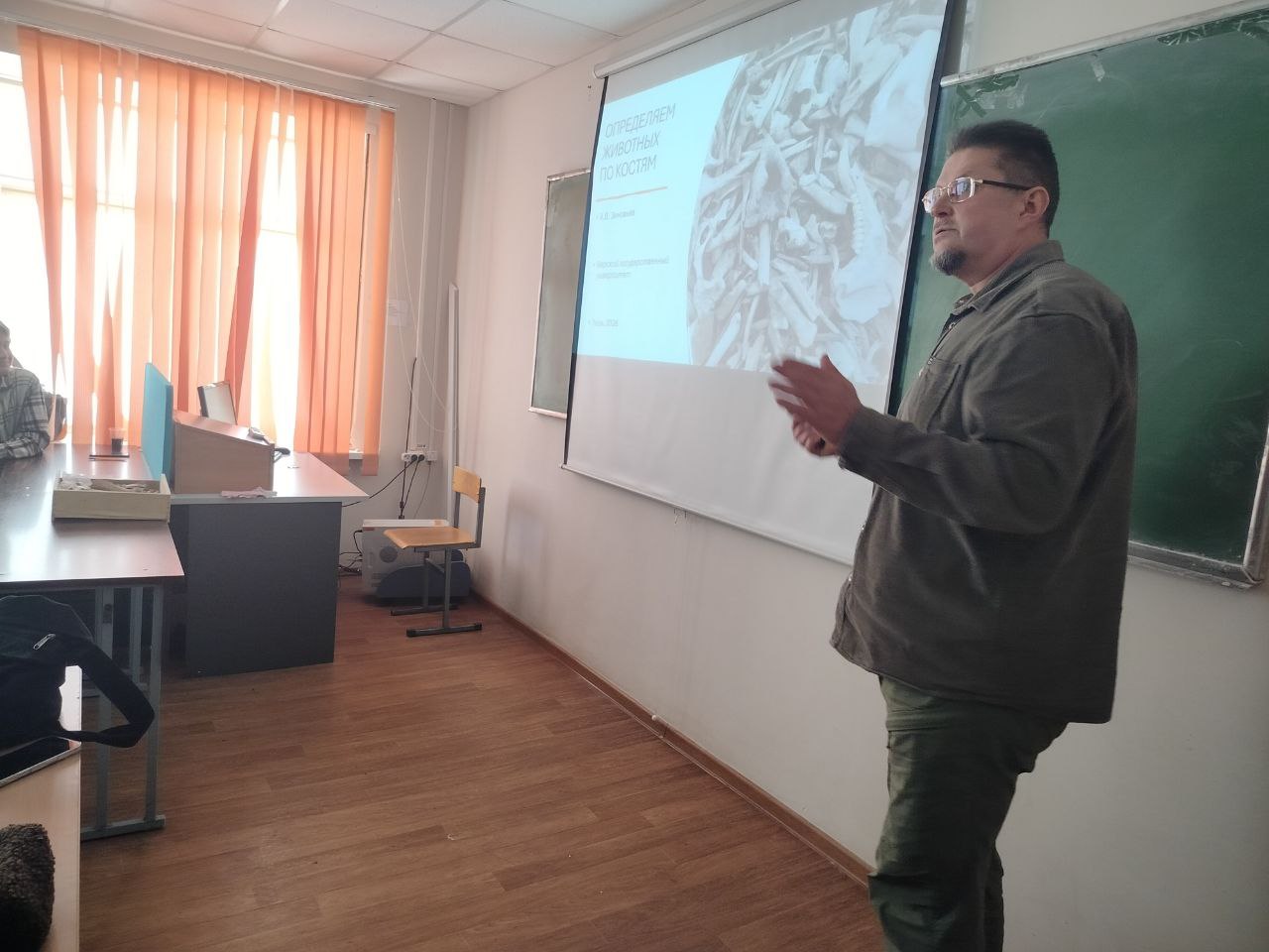 Ведущим встречи выступил заведующий кафедрой зоологии и физиологии ТвГУ доктор биологических наук Андрей Валерьевич Зиновьев, который обозначил ключевую логику работы зооархеолога: от фиксации контекста и первичной сортировки материала к определению элемента скелета, таксона и последующему анализу — экологии, хозяйственных практик, сезонности, следов обработки и последующих изменений. В ходе обсуждения участники рассмотрели, почему кость остаётся «механической биографией» животного (форма как функция, особенности суставных поверхностей, гребней и кортикального слоя), какие инструменты необходимы для достоверной идентификации (эталонные коллекции и специализированные атласы), и почему этика обращения с материалом, маркировка и полная трассируемость образца являются обязательным условием научной ценности результатов.